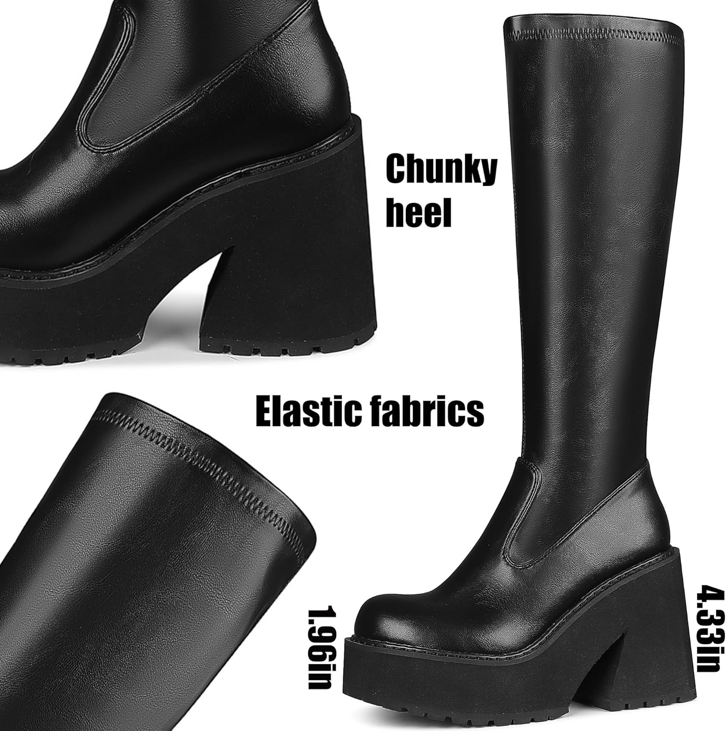 Constructed with high-quality materials, these knee-high boots feature a sturdy platform and chunky block high heel that provides both style and stability. The elastic material ensures a comfortable and snug fit, while the zipper closure allows for easy on and off. The round toe design adds a touch of sophistication, making these boots a versatile addition to your wardrobe.